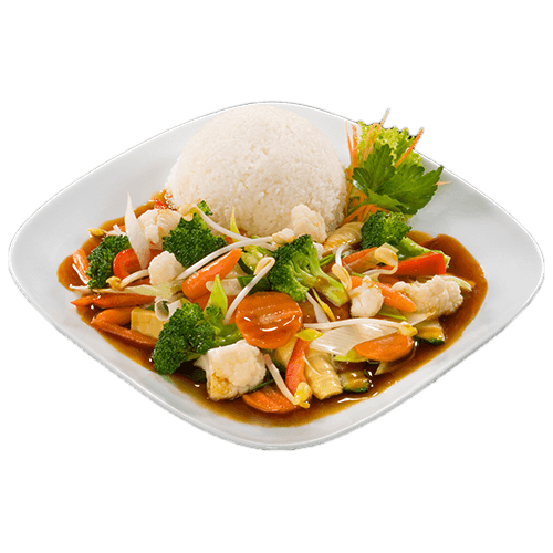 Alle Gerichte werden mit Reis oder mit gebratener Nudeln gegen Aufschlag von 1,50 Euro serviert.